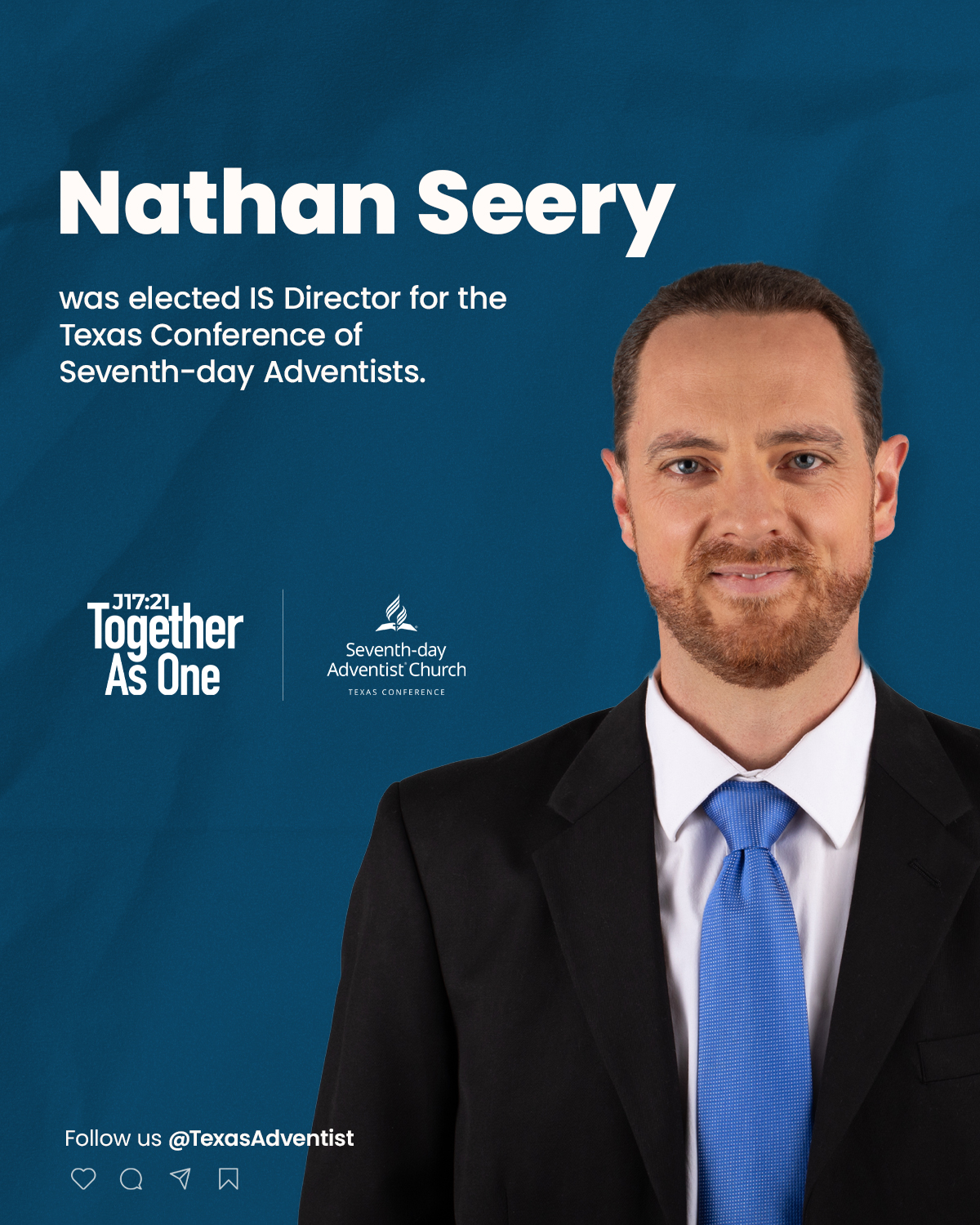 Los miembros del Comité Ejecutivo de la Conferencia de Texas de los Adventistas del Séptimo Día, durante una sesión especialmente convocada el 18 de diciembre de 2025, votaron para elegir a Nathan Seery como el nuevo director de Sistemas de Información (SI) con efecto a partir del 12 de enero de 2026. Seery reemplazará a Zeb Worth, quien se jubilará el 31 de enero de 2026.
